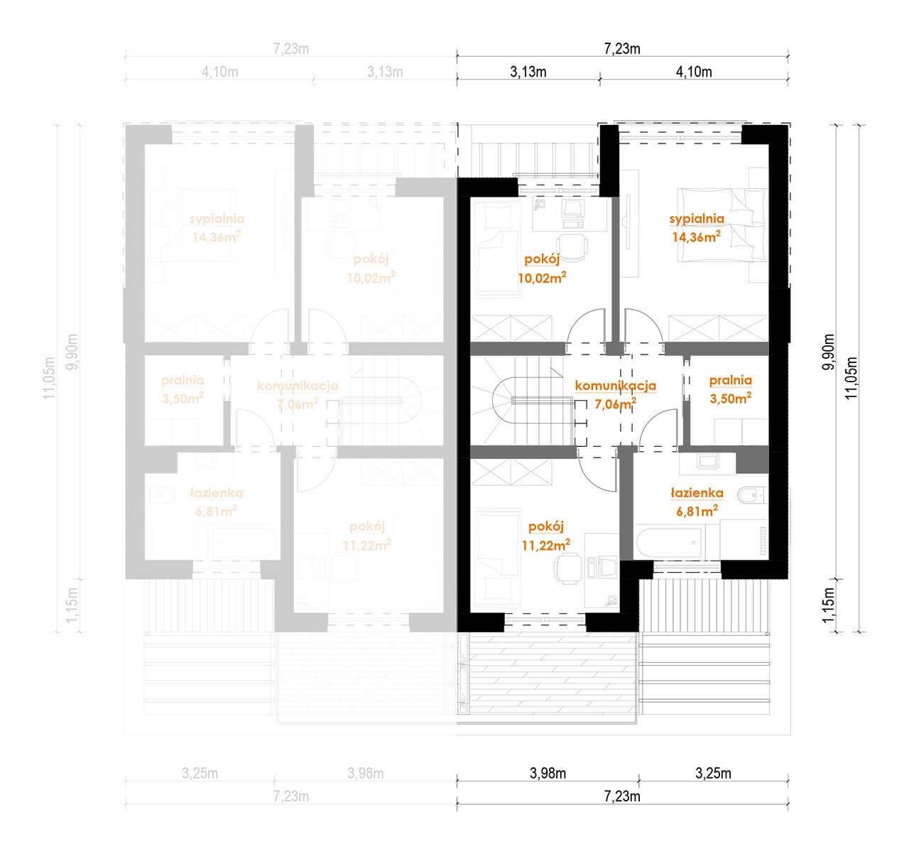 Rzut piętra z przykładowym rozmieszczeniem pomieszczeń